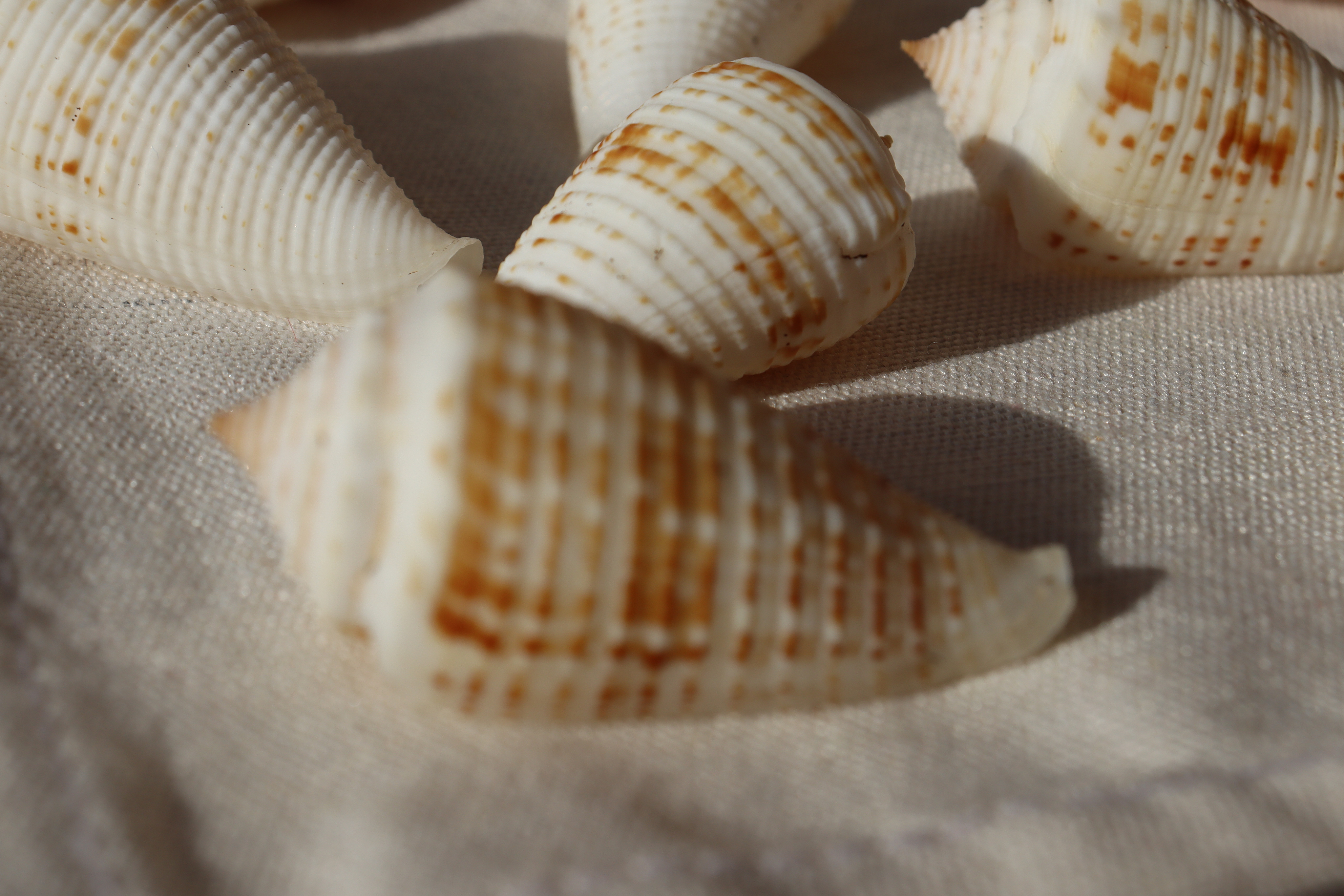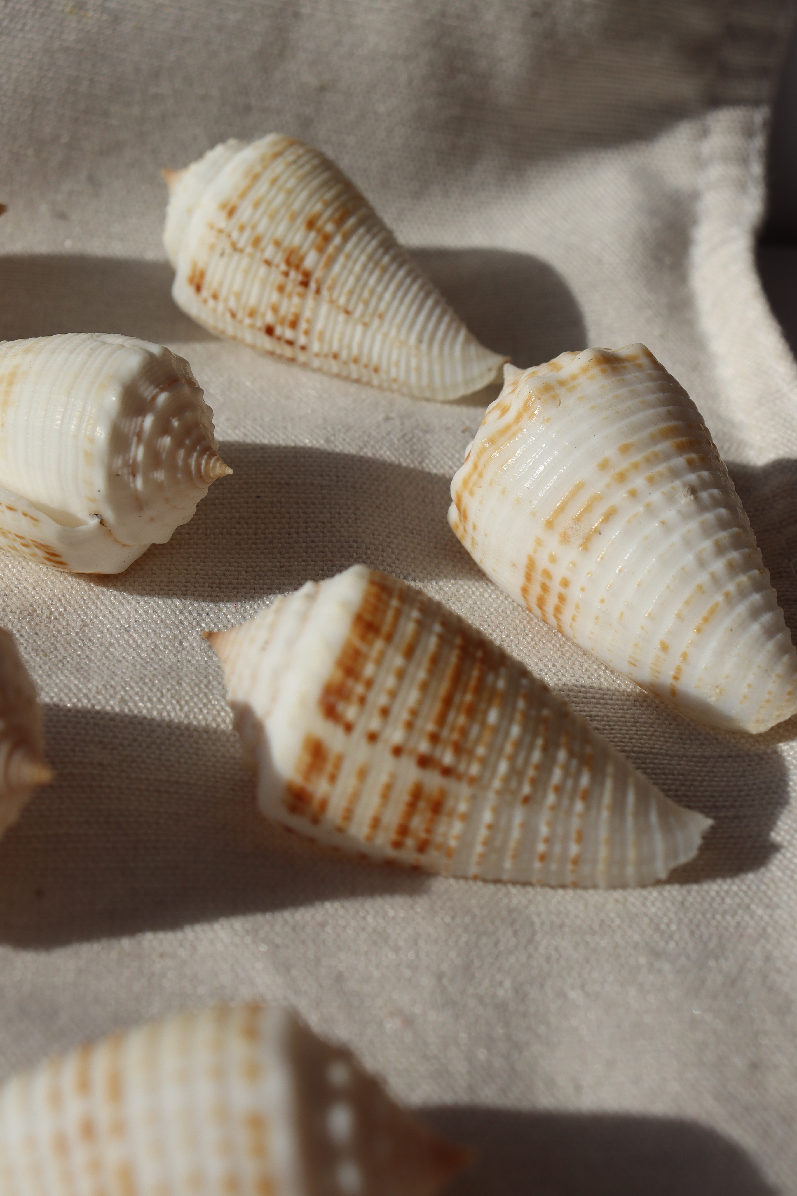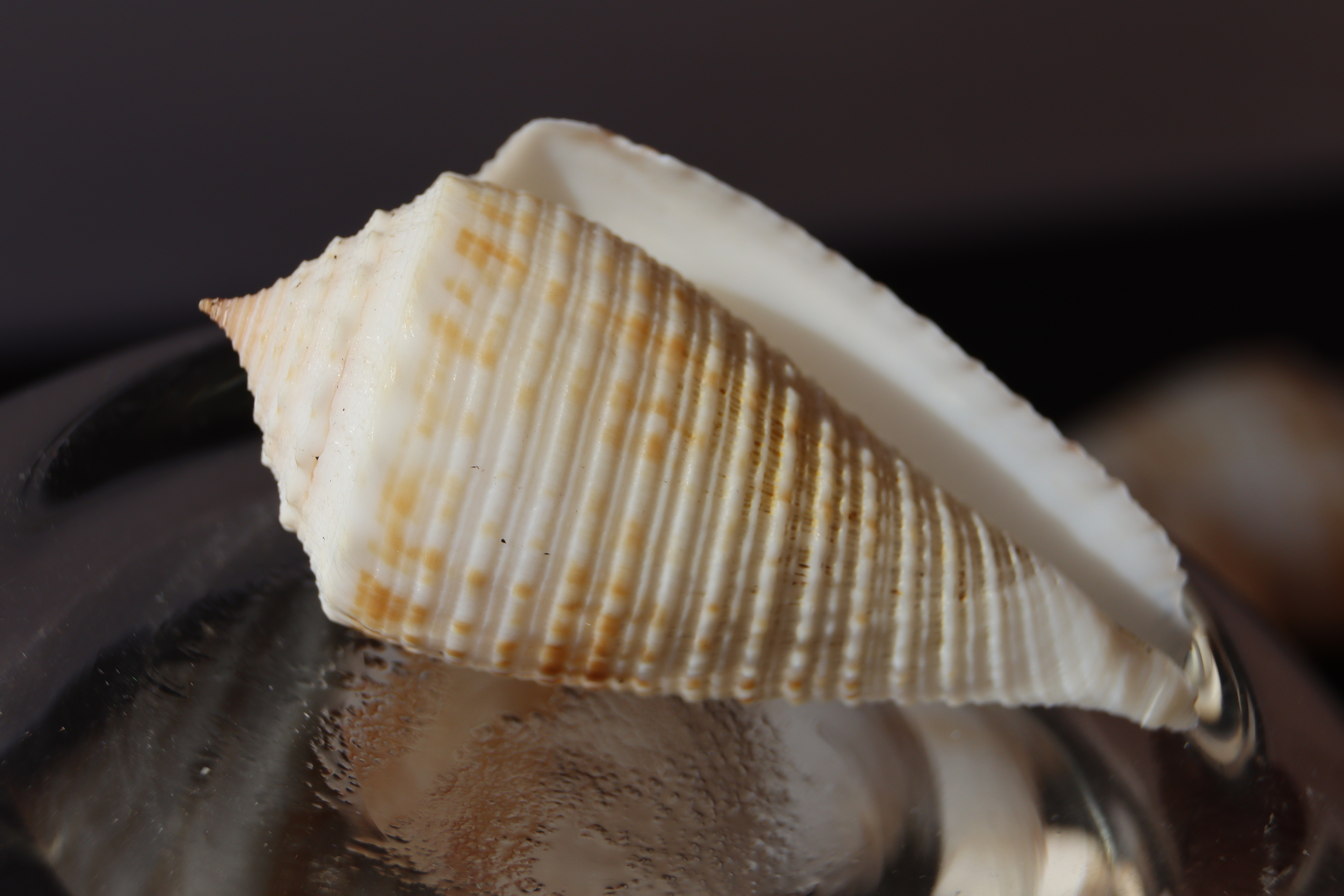 Морская раковина конической формы. Поверхность раковины ребристая, матовая. Поверхность бежевого оттенка с поперечными коричневыми линиями. Цвет ракушки может варьироваться от светлого до светло-коричневого.